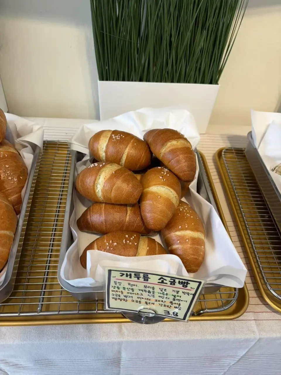 | 개두릅소금빵 | 3,500원 | 짭조름한 소금빵에 개두릅 풍미를 살린 빵 |