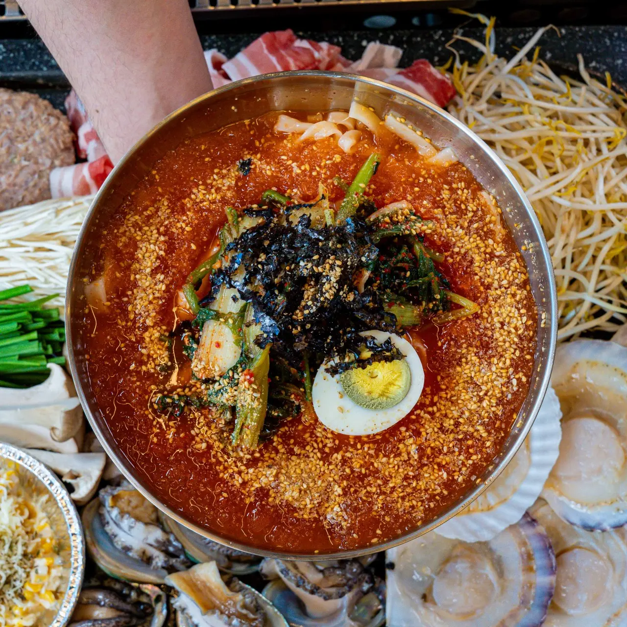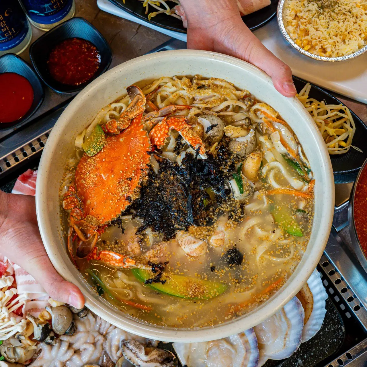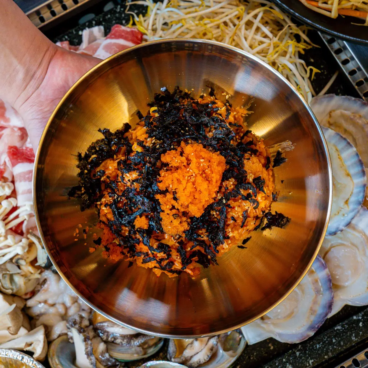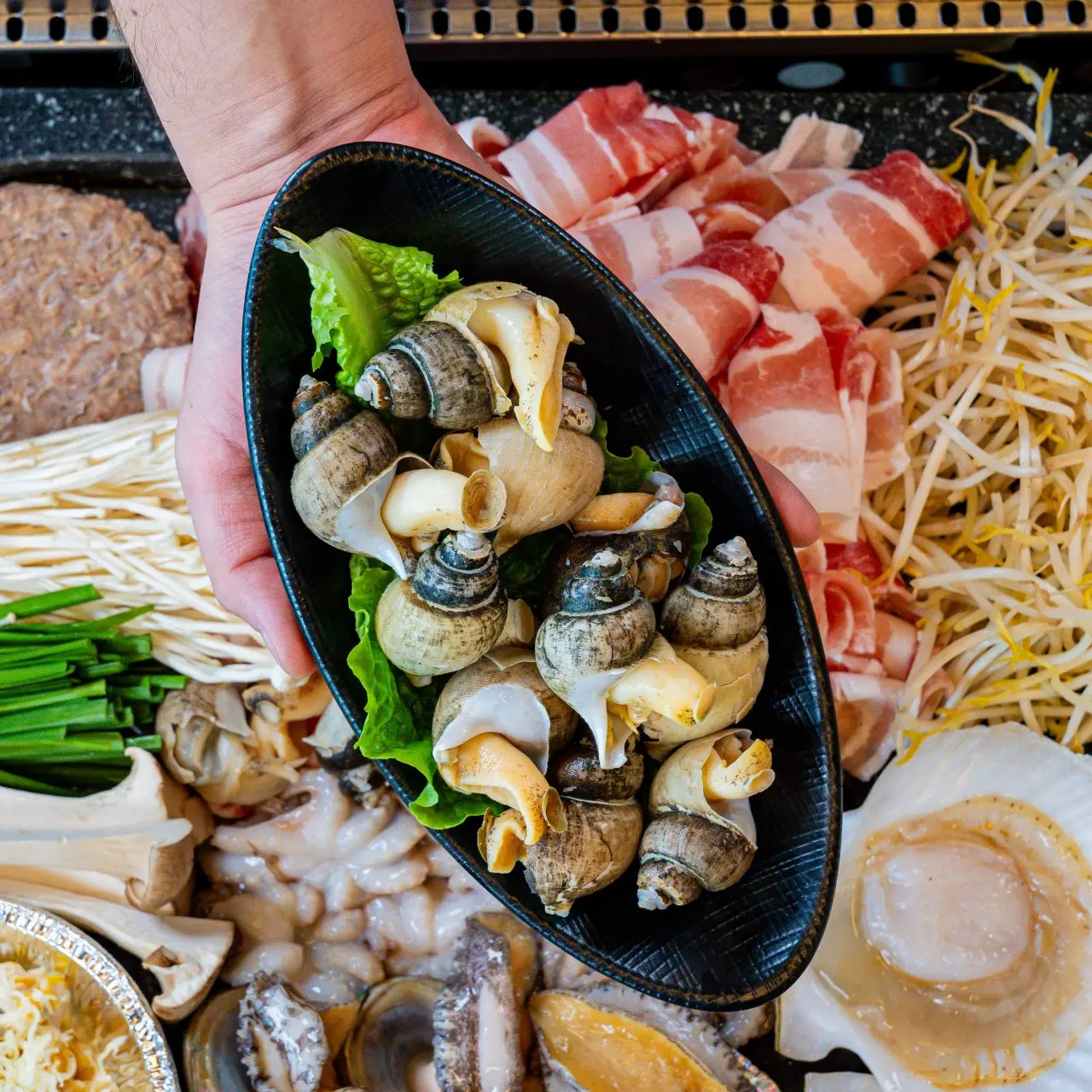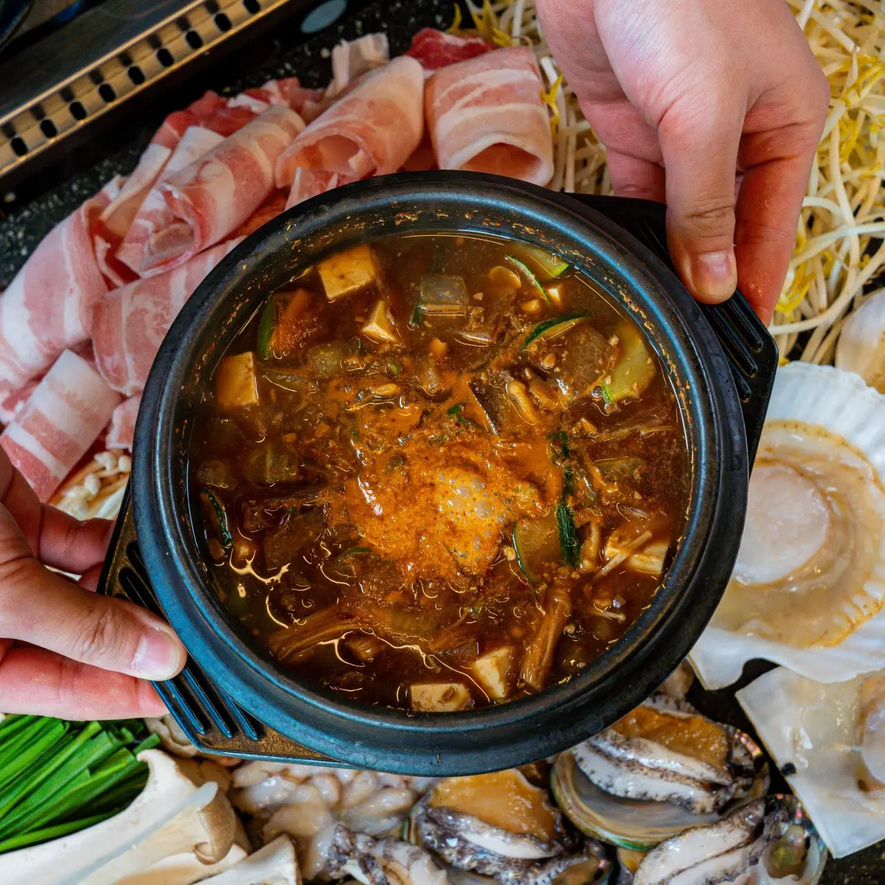 - 흑돼지(오겹 또는 대패), 전복, 새우, 가리비, 키조개, 버섯, 쭈꾸미, 골뱅이 등 구성은 세트 종류와 인원수에 따라 달라져요.