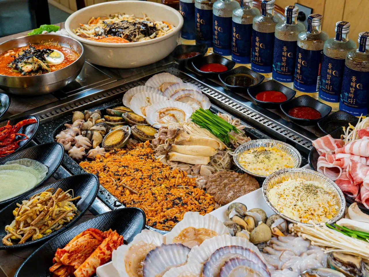 해돈가의 하이라이트는 돼지고기와 해산물을 한 번에 즐길 수 있는 삼합 세트(해돈가삼합세트·돌판 삼합세트)예요. 지례 흑돼지 구이에 전복, 새우, 가리비, 키조개, 쭈꾸미, 골뱅이, 버섯 등 구성이 푸짐해 사진 찍기에도 좋고, 술안주와 식사를 동시에 해결하기 딱 좋다는 평가가 많아요.