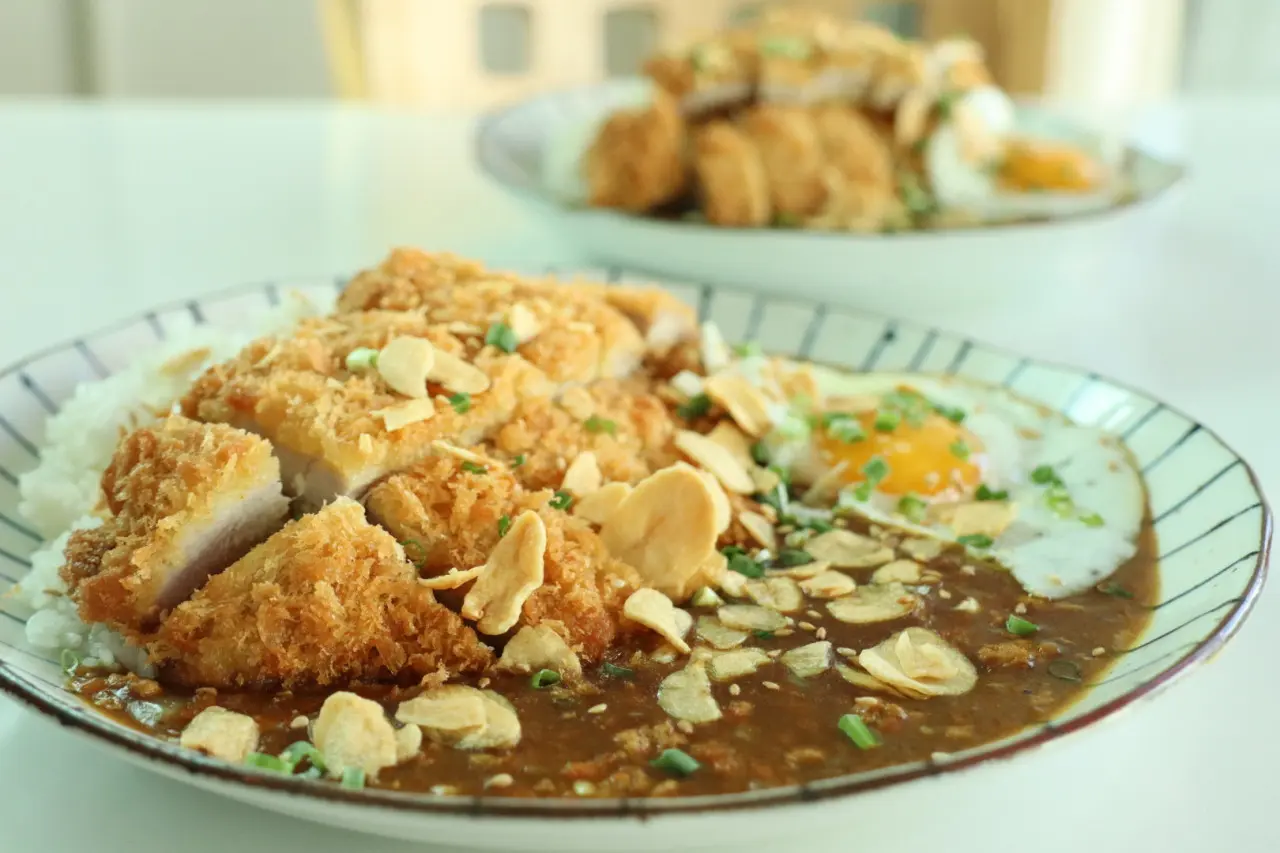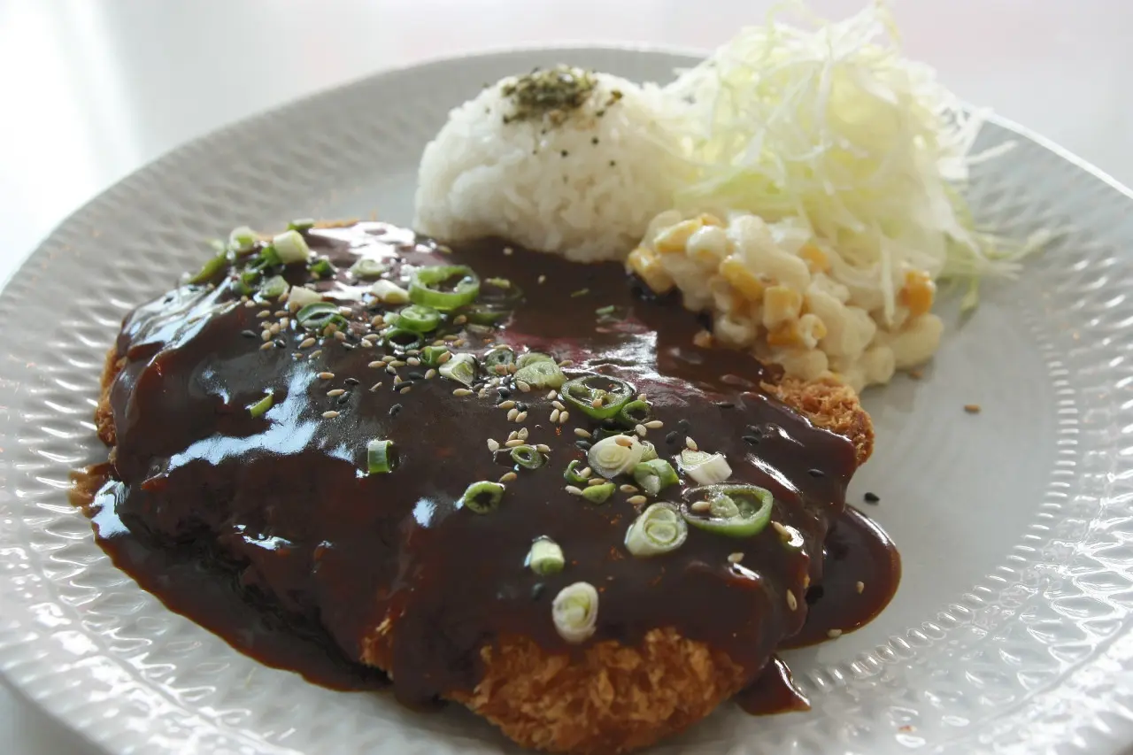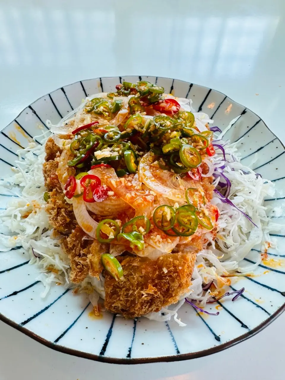 - 두툼한 돈가스 위에 영양고추와 양파, 양배추 등이 올라가 비주얼부터 묵직한 메뉴예요.