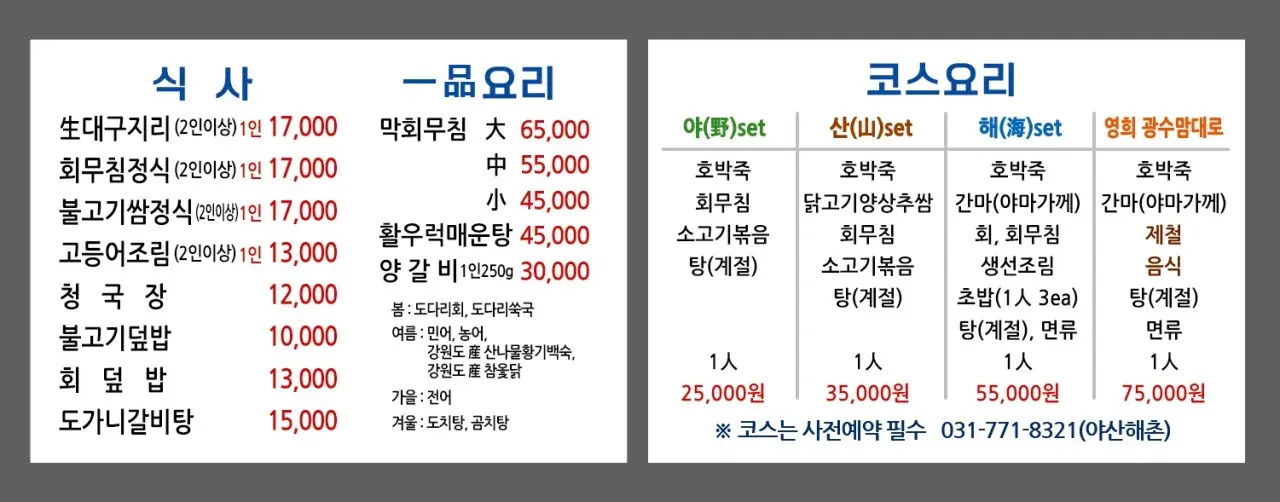 야산해촌에서 즐길 수 있는 대표 메뉴를 표로 정리해볼게요.