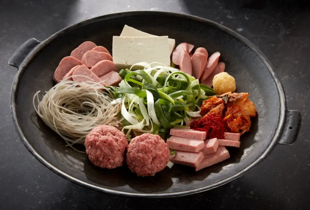 • 맑은 채소 육수에 스팸·소시지·다진 쇠고기·두부·당면 등을 듬뿍 넣고, 직접 숙성한 김치와 비법 양념으로 깊은 맛을 내는 것이 특징이에요.