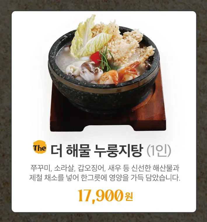 | 더 해물 누룽지탕 | 쭈꾸미, 갑오징어, 새우, 소라살 등 신선한 해산물과 제철 채소가 듬뿍 들어간 영양 가득 한 그릇 | 17,900원 |