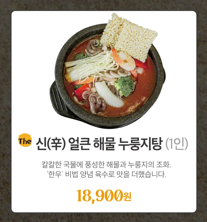 | 얼큰 해물 누룽지탕 | 한우 비법 양념육수에 해물과 누룽지를 넣어 칼칼하게 즐기는 국물 요리 | 18,900원 |