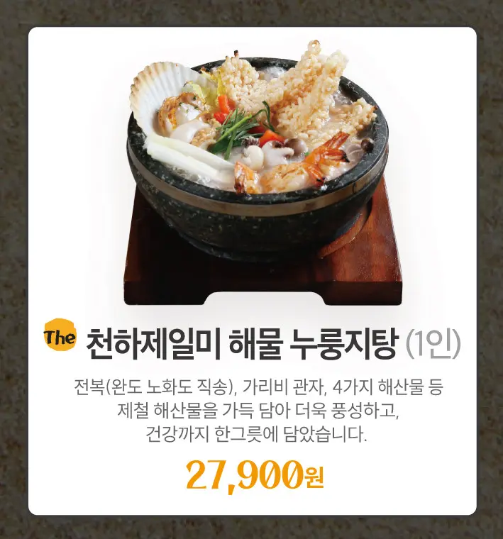 | 천하제일미 해물 누룽지탕 | 완도 노화도 전복, 가리비 관자 등 제철 해산물을 풍성하게 담은 럭셔리 누룽지탕 | 27,900원 |