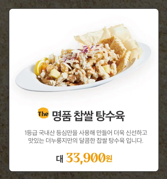 | 명품 찹쌀 탕수육(대) | 바삭함과 달콤함이 더한 대용량 버전 | 33,900원 |