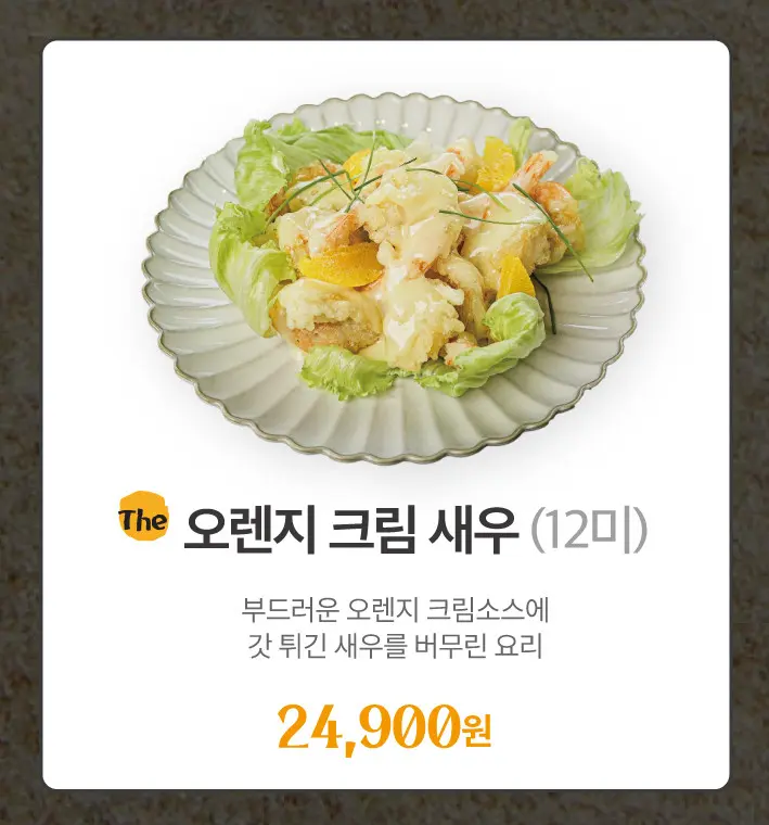| 오렌지 크림 새우 | 새콤달콤한 오렌지 소스가 어우러진 부드러운 새우 튀김 | 24,900원 |