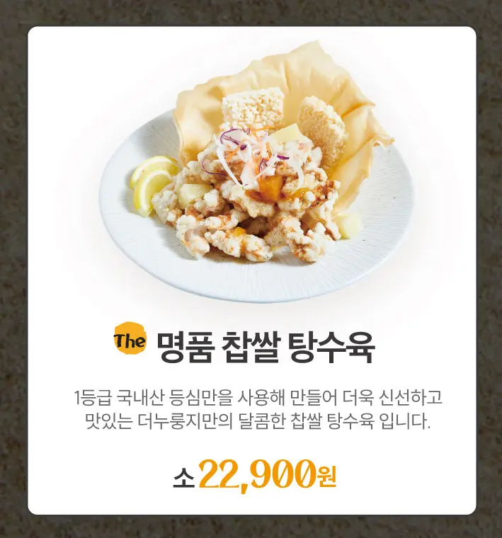| 명품 찹쌀 탕수육(소) | 1등급 국내산 등심으로 만든 쫄깃한 찹쌀 탕수육 | 22,900원 |