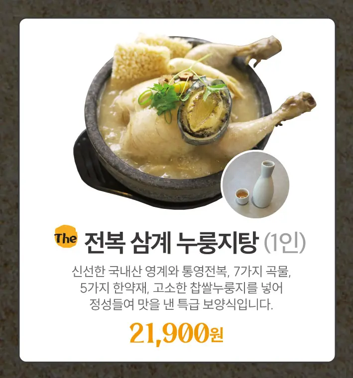 | 전복 삼계 누룽지탕 | 국내산 영계, 통영 전복, 곡물과 한약재, 찹쌀 누룽지로 끓여낸 특급 보양식 | 21,900원 |