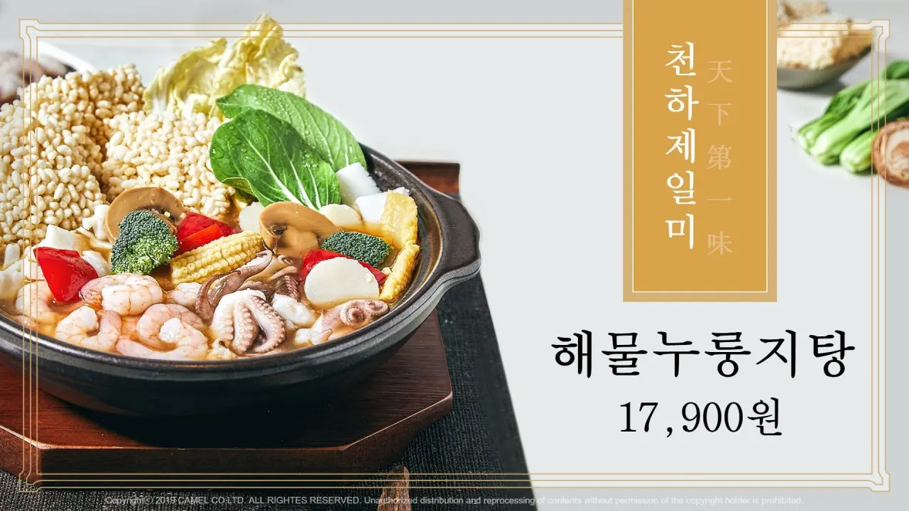 | 더 해물 누룽지탕 | 쭈꾸미, 갑오징어, 새우, 소라살 등 신선한 해산물과 제철 채소가 듬뿍 들어간 영양 가득 한 그릇 | 17,900원 |