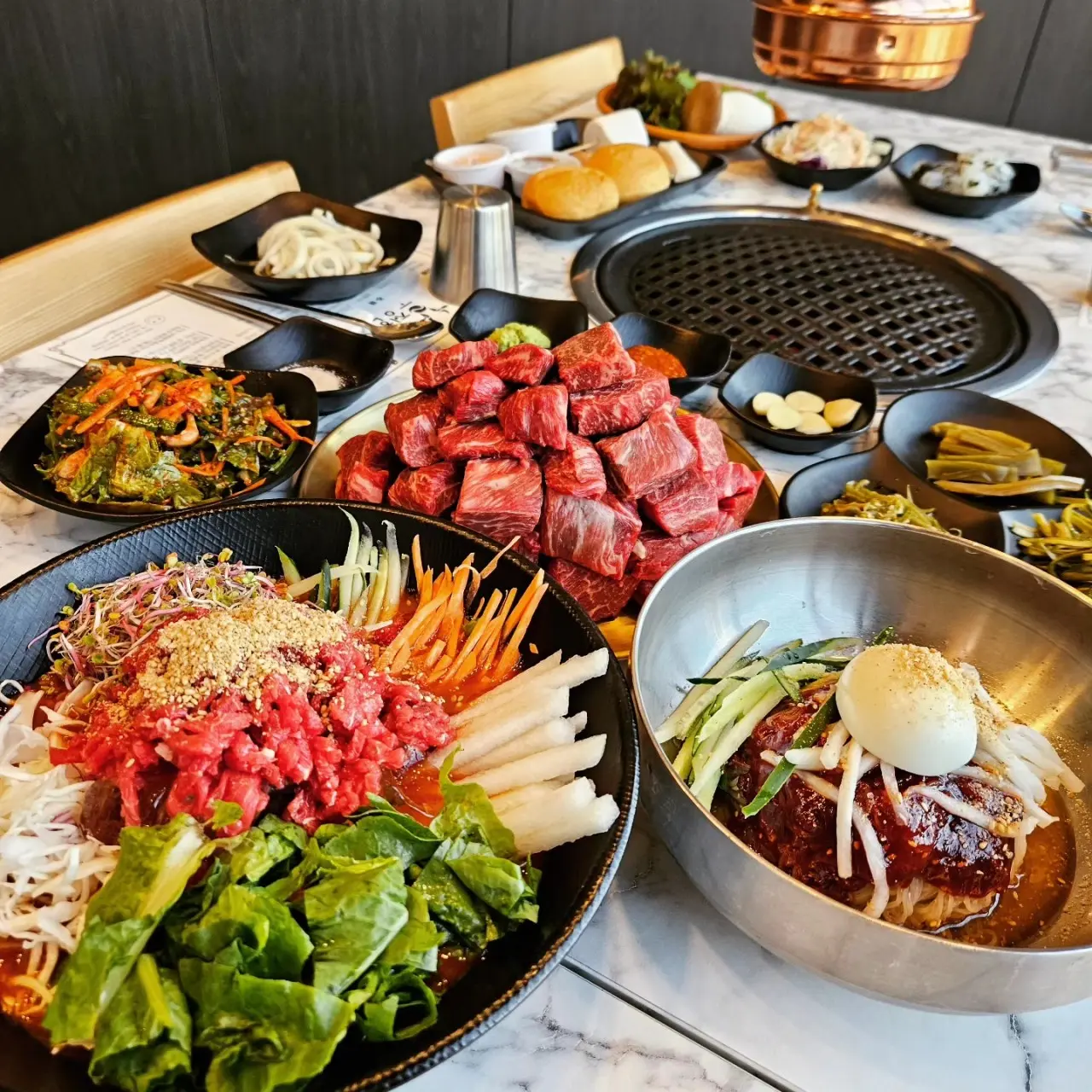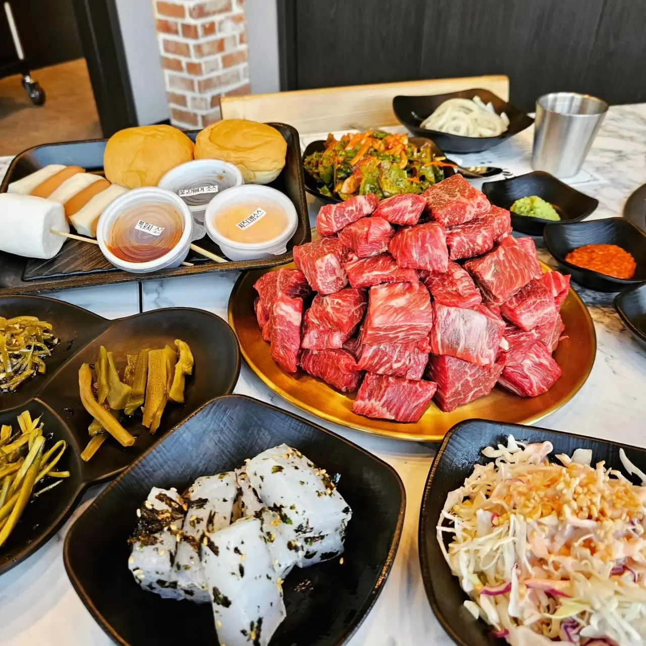 • 샐러드, 부침개, 젓갈, 파절이, 무생채 등 반찬 구성이 풍성하고, 셀프바를 통해 원하는 반찬을 여러 번 가져다 먹을 수 있어 고기와 함께 곁들이기 좋아요.