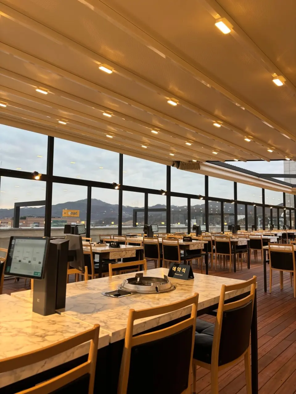 비가 오거나 추운 날에도 이용할 수 있도록 지붕이 열리고 닫히는 구조라는 점이 특징이라, 계절에 크게 구애받지 않고 루프탑 고깃집의 매력을 즐길 수 있어요. 넓은 좌석 간격 덕분에 아이 동반 가족도 비교적 편하게 이용했다는 후기가 많은 편입니다.