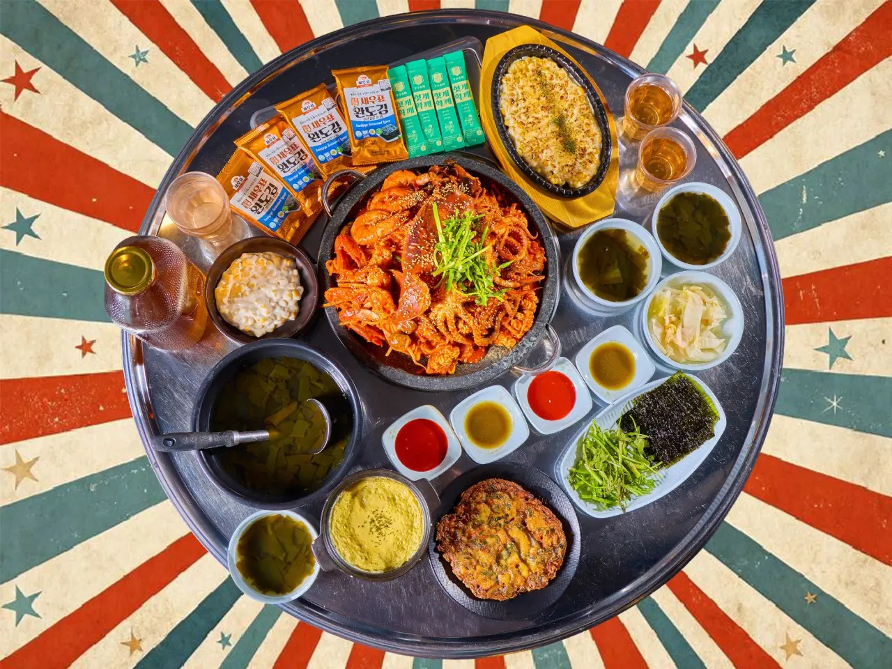 - 돌판 해물아구찜에 백김치·콘치즈·계란찜·완도미역국·해물파전·완도김·와사비간장이 함께 나오는 풀 구성이에요