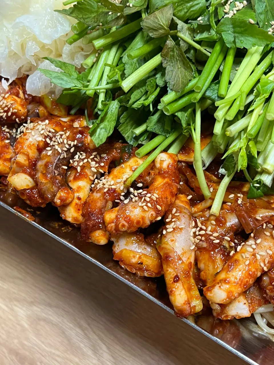 - 직화 방식의 산낙지볶음, 센 불에 빠르게 볶아내 낙지의 쫄깃한 식감과 불향을 살렸어요