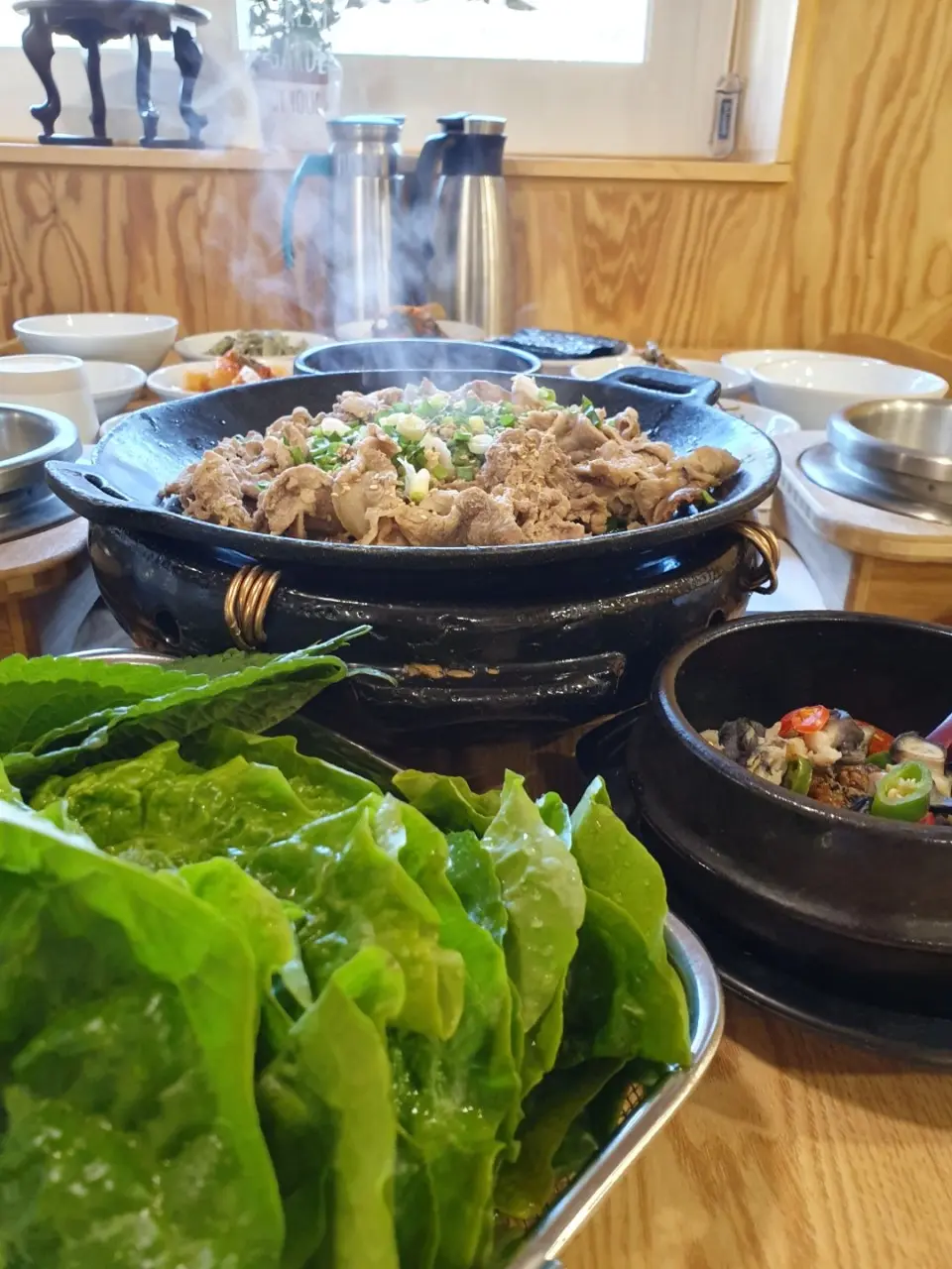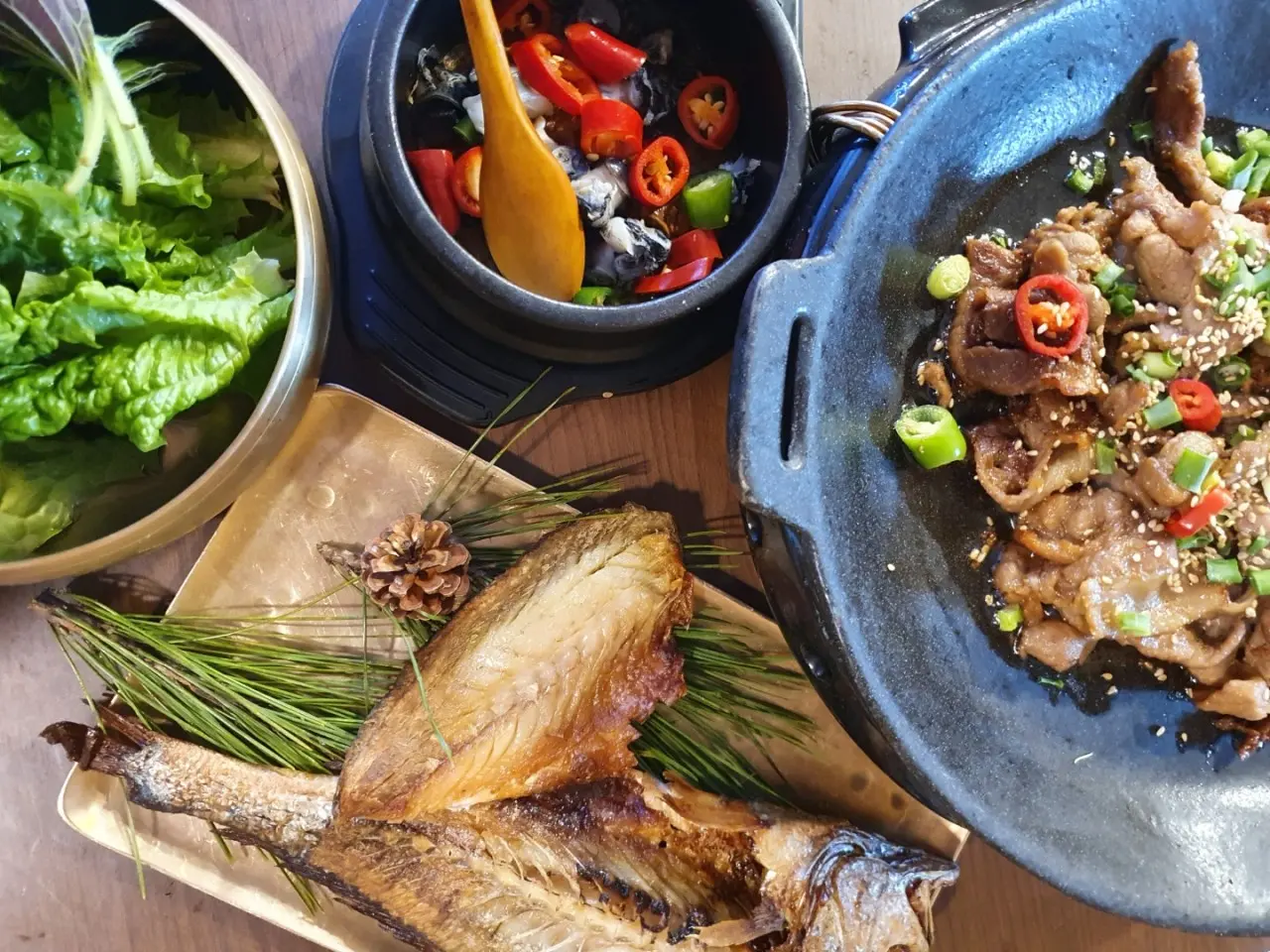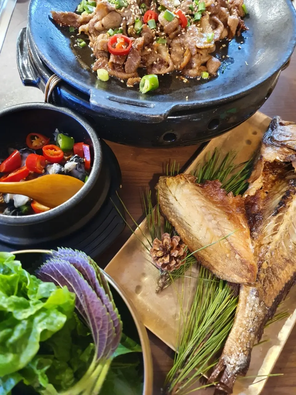 - 남도식 정갈한 밥상, 철판 제육불고기·두부 청국장·우렁쌈장·야채쌈·시골 제철 반찬이 한 상 가득 차려져 나와요