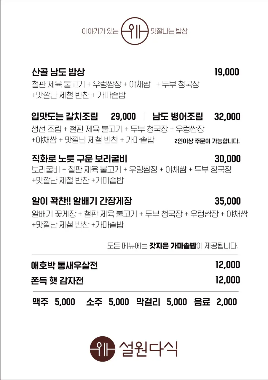 | 산골에서 맛보는 남도밥상 | 19,000원 | 철판 제육불고기+청국장+우렁쌈장+가마솥밥 |