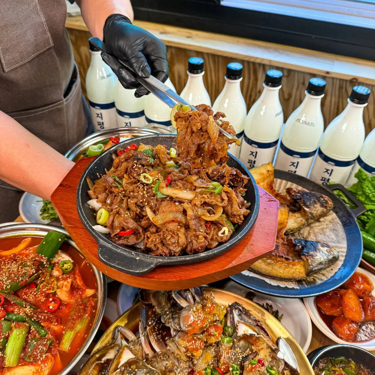 - 철판 제육불고기 + 두부 청국장 + 우렁쌈장 + 야채쌈 + 시골 제철 반찬 + 가마솥밥 구성이에요