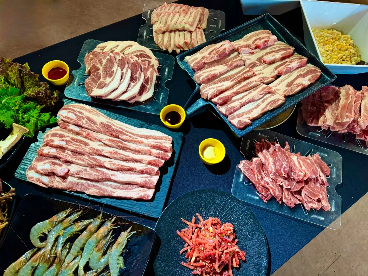 - 고기 구성: 국내산 삼겹살, 목살, 항정살, 가브리살, 갈매기살 등 한돈 위주 6~7종과 우삼겹, 양념 목살 등이 제공돼요.