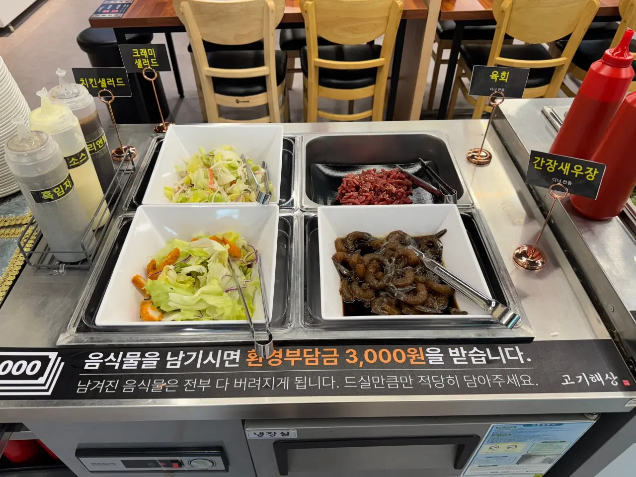 - 셀프바: 샐러드, 튀김, 밑반찬, 한강라면(셀프 라면) 등 사이드 메뉴도 다양해 고기만 먹기 지루하지 않게 구성되어 있답니다.