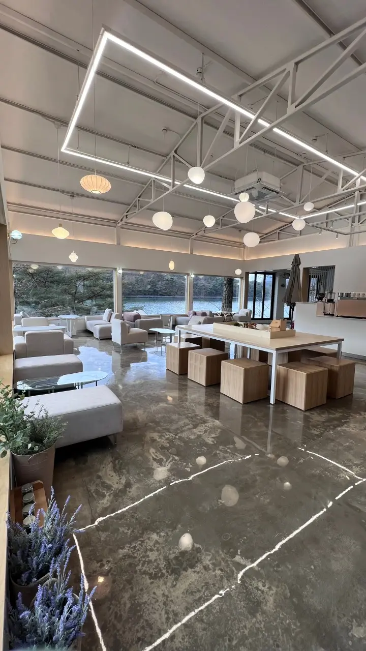 얼리빈스는 산정호수 둘레길 라인에 붙어 있어서 카페 안에서도 호수 풍경이 그대로 들어와요. 3층 규모의 넓은 실내와 통창, 호수 방향 좌석 배치 덕분에 어디에 앉아도 뷰가 좋은 편이랍니다.