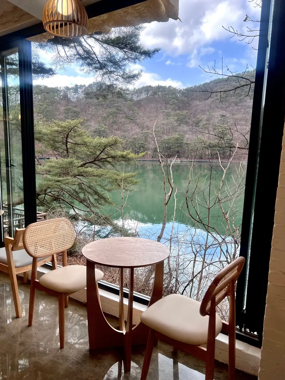 - 호수뷰: 1층부터 3층까지 산정호수 뷰를 시원하게 볼 수 있도록 창이 크게 나 있어요.
