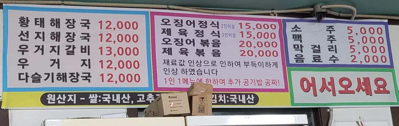 | 황태해장국 | 방송에 소개된 대표 메뉴, 뽀얀 황태 국물 해장국 | 12,000원 |