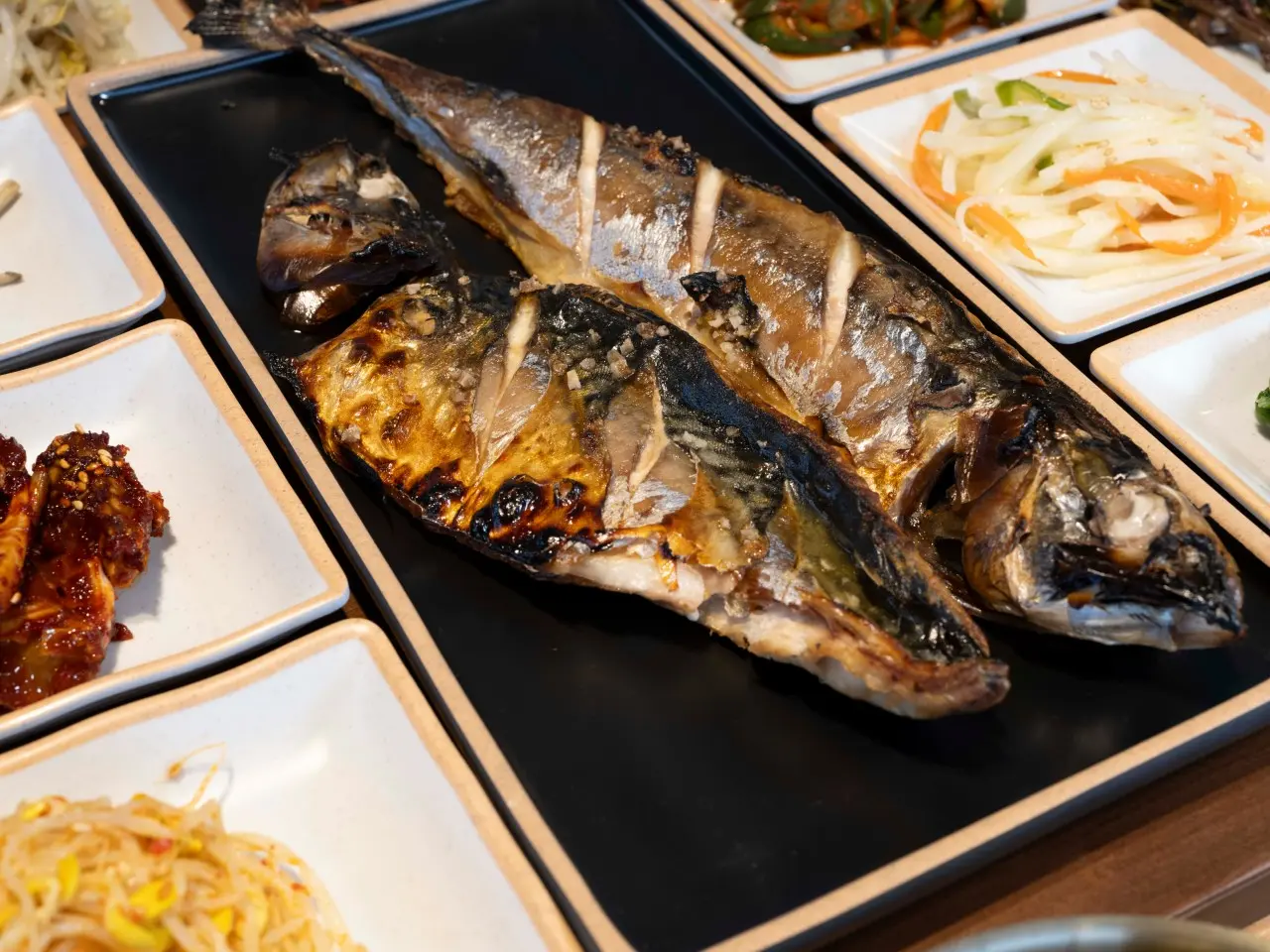 이 집의 하이라이트는 단연 화덕에서 바로 구워내는 생선구이와 반찬 구성이에요. 고등어와 갈치뿐 아니라 가자미, 삼치, 이면수, 뽈락 등 여러 생선을 화덕에 넣어 한 번에 구워내서 점심·저녁 피크에도 생선이 계속 갓 구운 상태로 나와요.
