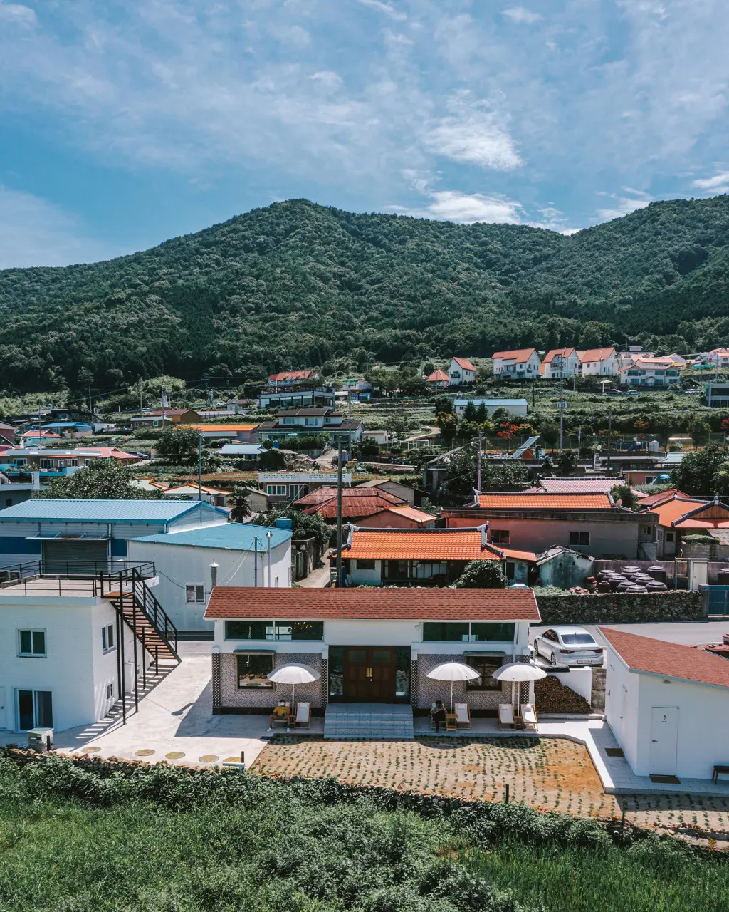 유즈노모레는 남해 삼동면 물건리, 물건방조어부림과 물건항 근처 조용한 주택가에 자리 잡고 있어요. 낡은 주택을 정성스럽게 리모델링해 만든 공간이라, 골목을 돌다 보면 갑자기 이국적인 카페가 나타나는 느낌이에요.