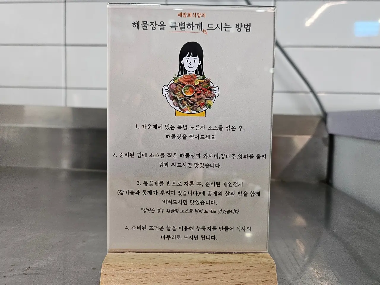 - 메뉴 선택 팁 : 처음 방문이라면 ‘모둠 해물장+솥밥 세트’ 혹은 ‘경주 회밥+물회’ 조합으로 맛을 보는 손님이 많다고 해요.