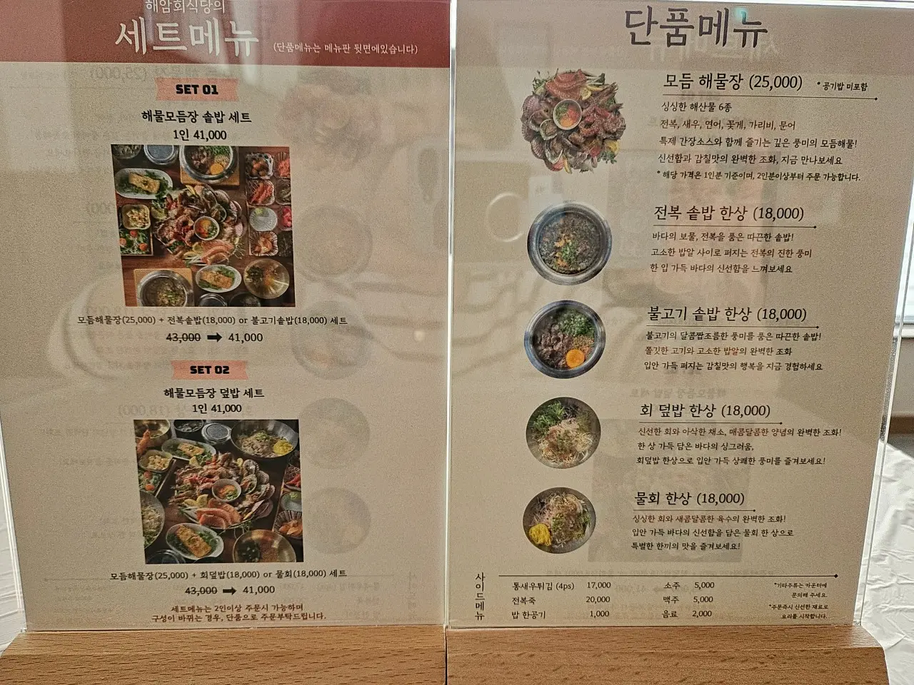 | 모둠 해물장 | 6가지 해물을 한 번에 즐기는 대표 해물장 메뉴 | 세트 기준 중~상 가격 |
