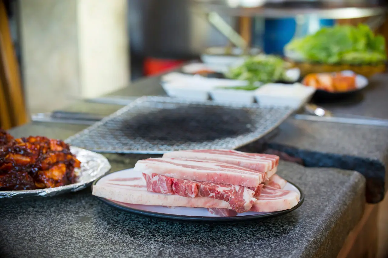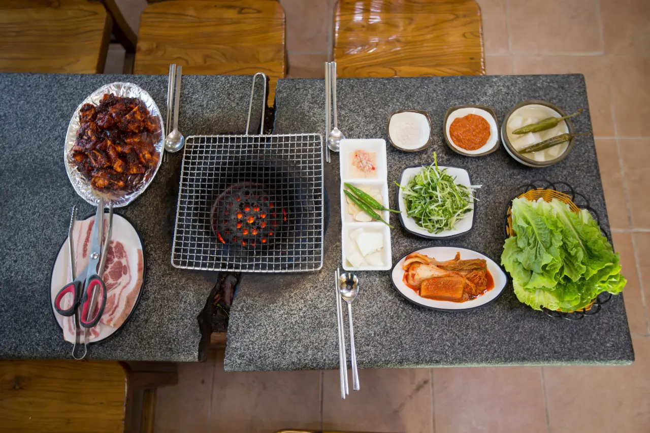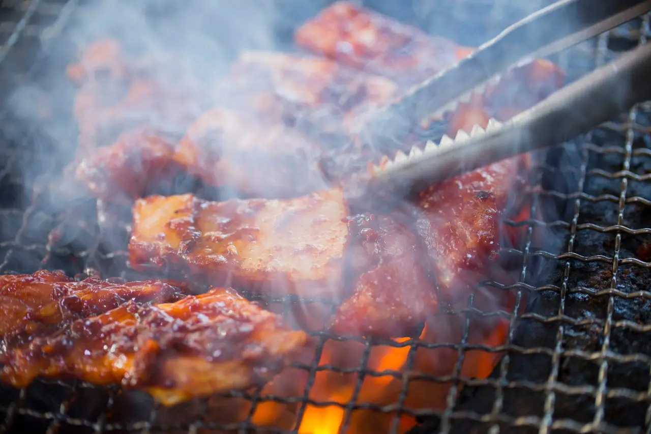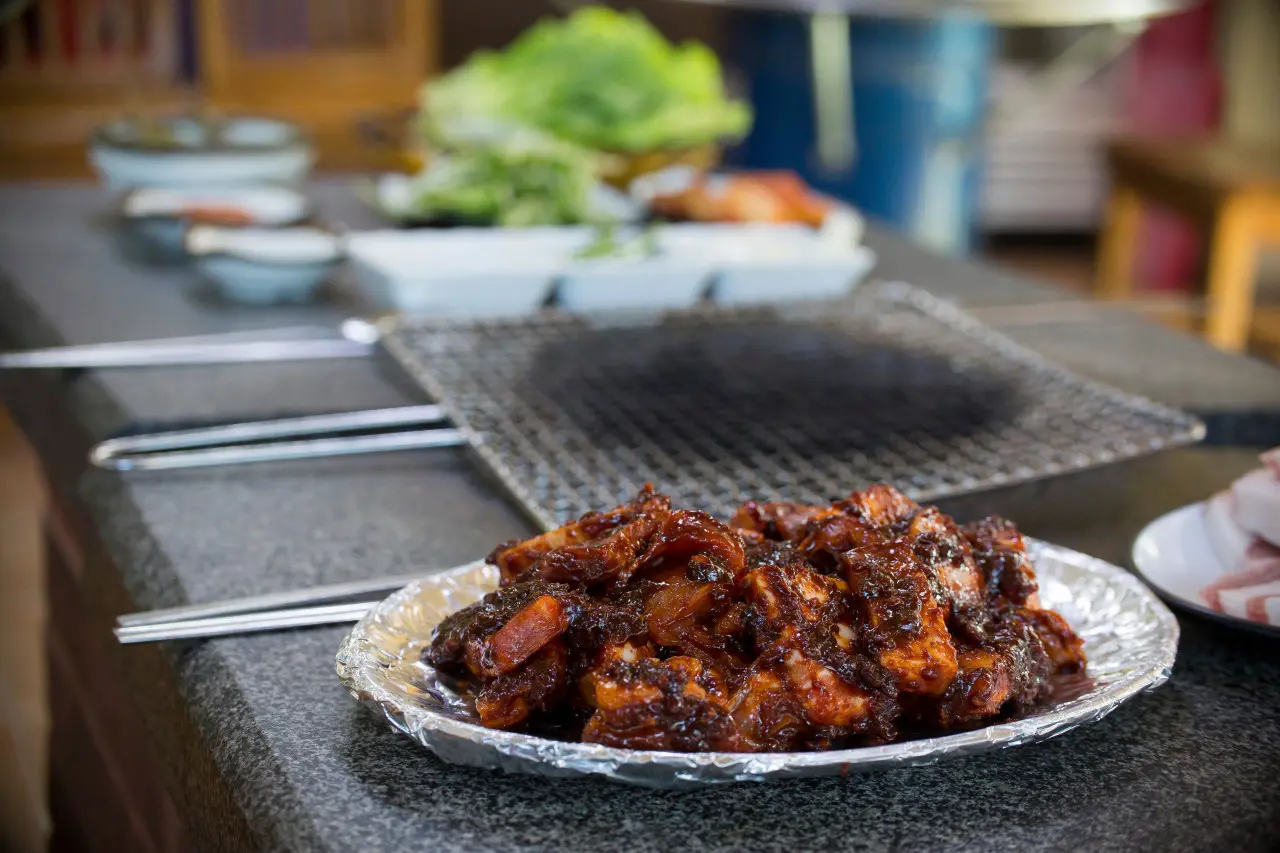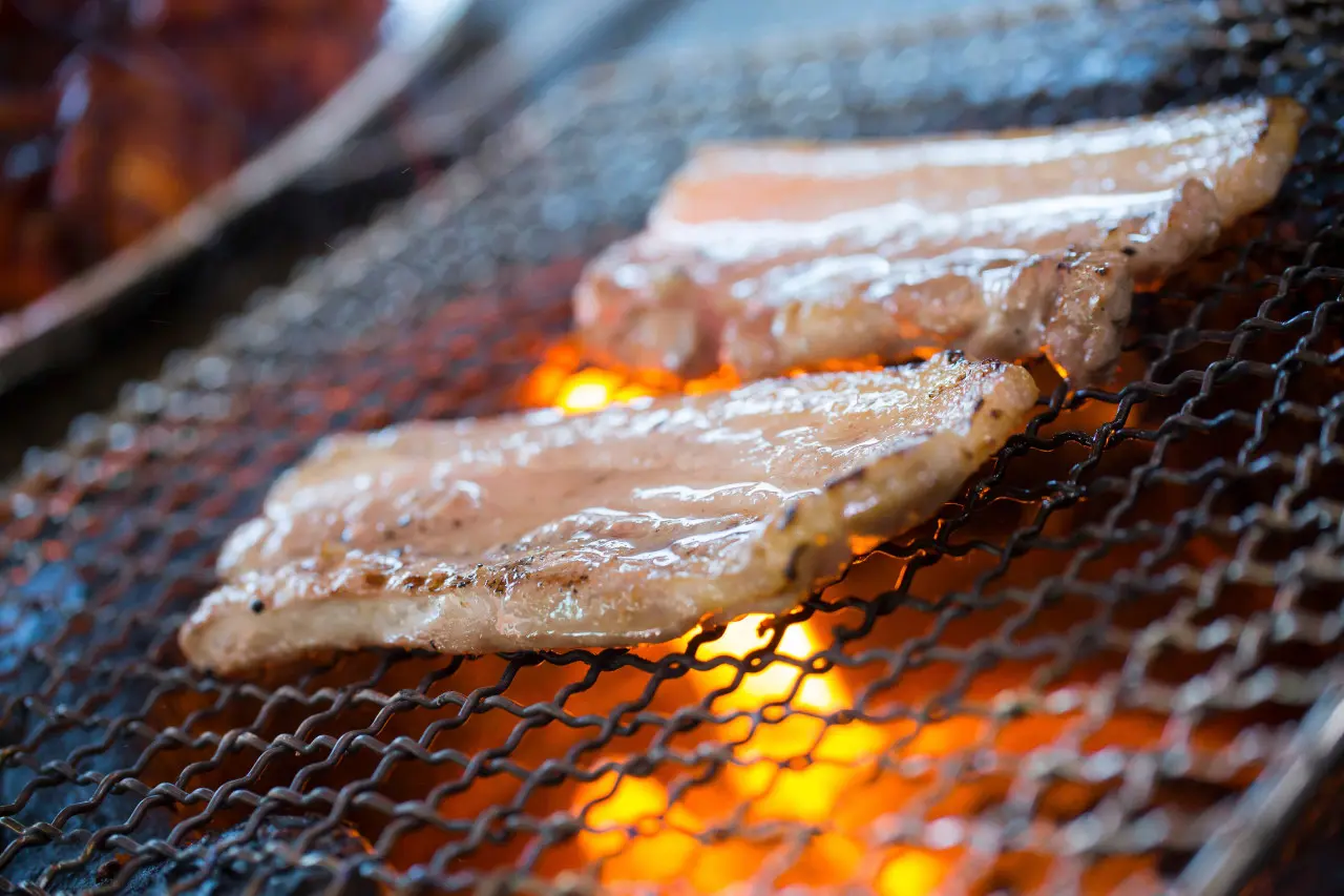 - 연탄불 위 석쇠에서 구워내는 전통 방식의 돼지고기 구이예요