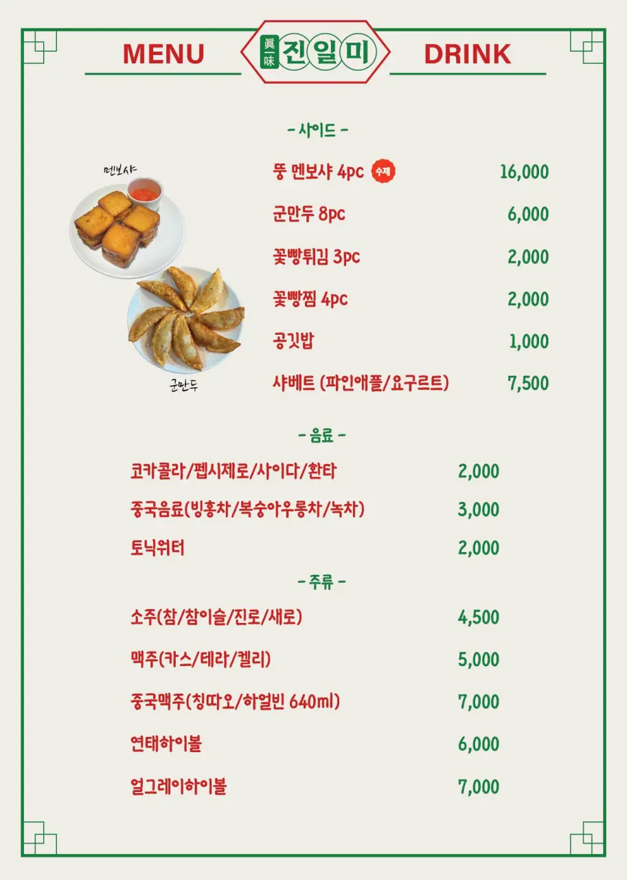 | 간짜장 | 강한 불향, 진한 소스, 오미자면 사용 가능 | 일반 중화요리 가격대 (현장 확인 권장) |