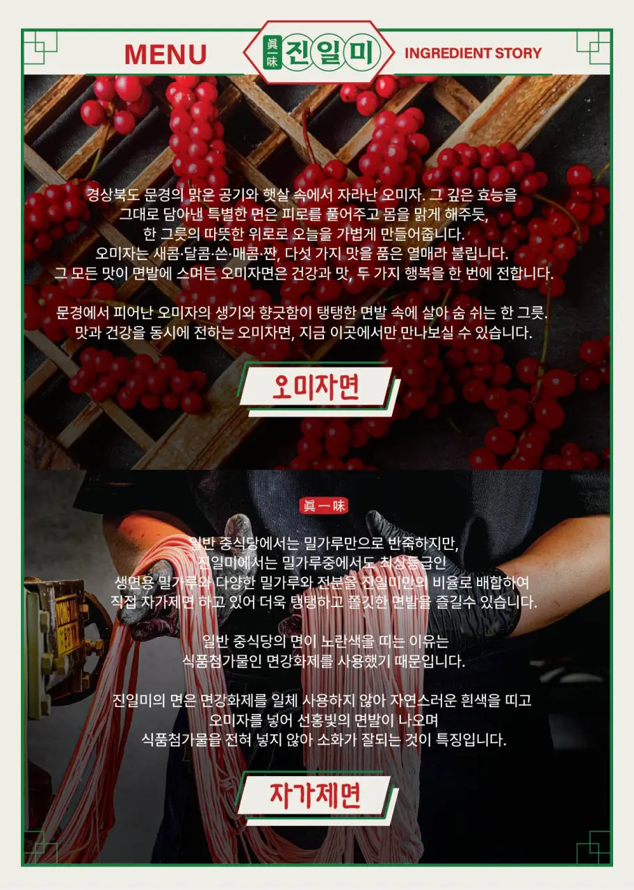 문경을 대표하는 오미자를 중식 면에 접목했다는 점에서, 관광객 입장에서도 여행의 기억에 남을 만한 메뉴 구성이에요.