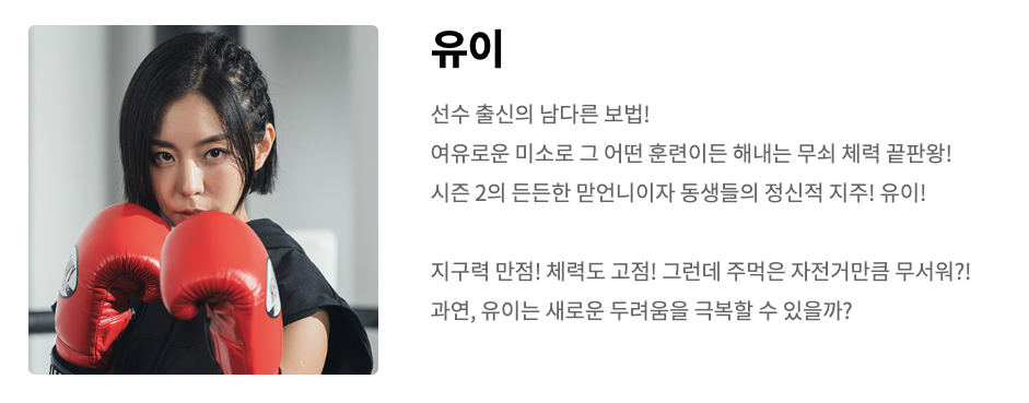 유이의 남다른 강인함과 친근한 미소, 그리고 끊임없는 성장의지는 <무쇠소녀단2>를 한층 더 재미있게 만들어줍니다. 다년간의 방송 경력만큼 다양한 매력으로 앞으로도 많은 사랑 받길 응원합니다!