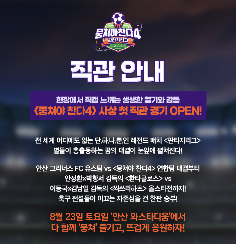 화면 너머로만 느꼈던 <뭉쳐야찬다4>의 뜨거운 열기를 직접 경험할 수 있는 단 한 번의 기회. 새로운 시즌, 한 번의 올스타전에서 뭉쳐 화합하는 감동을 꼭 잡으시길 바라요. 현장에서 여러분의 환호가 큰 힘이 될 거예요!