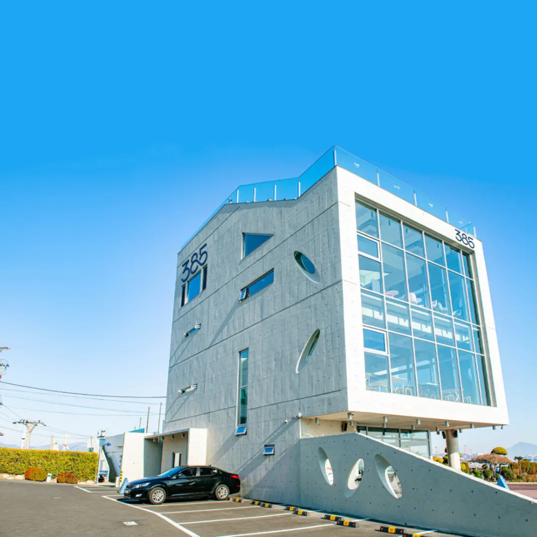 카페 385는 부산항대교와 오륙도까지 시원하게 내려다보이는 오션뷰 루프탑 카페예요. 실내외 좌석이 넓고 층별 콘셉트가 달라서 가족, 연인, 친구끼리 모두 편하게 즐기기 좋아요.