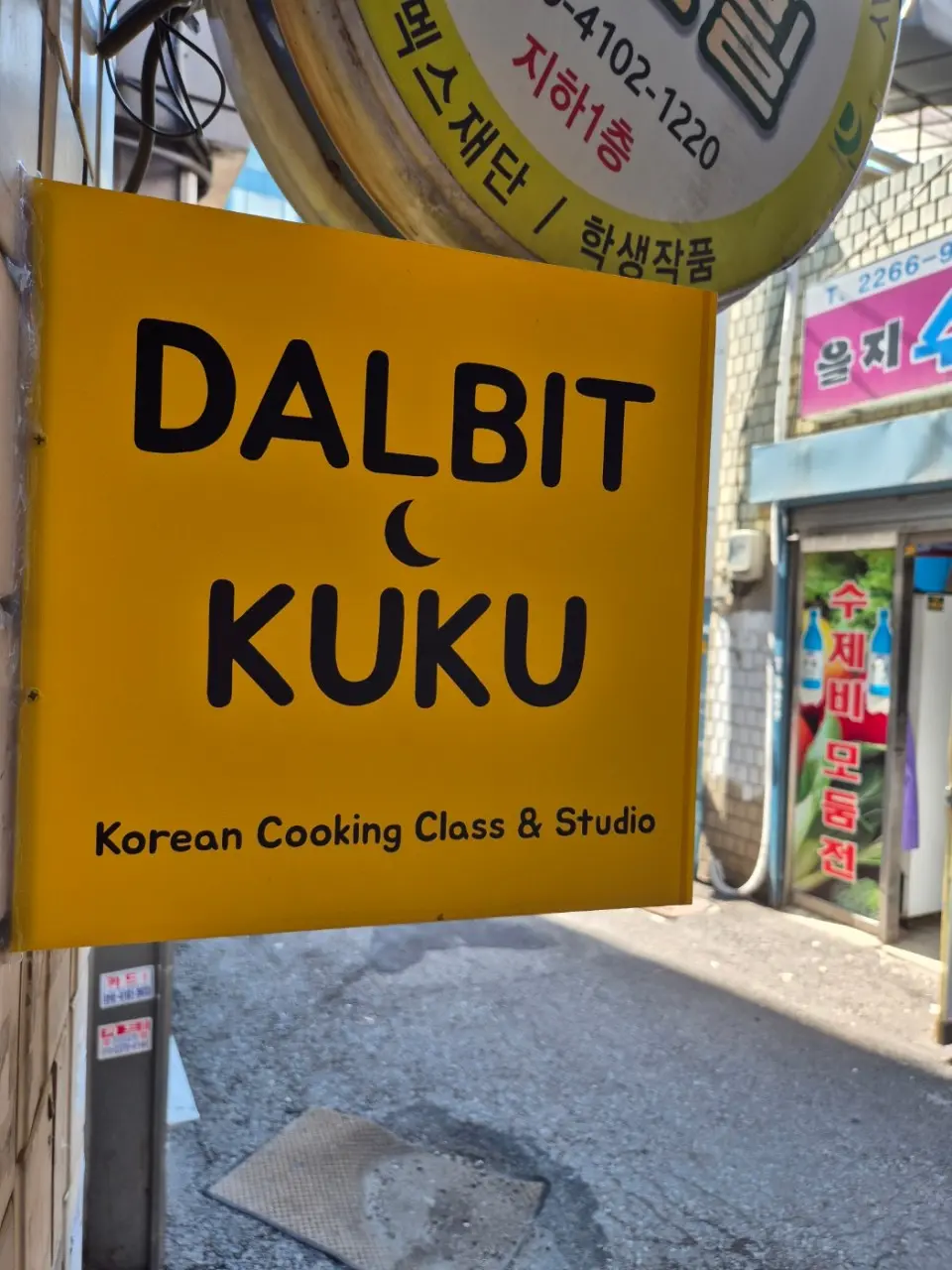 • 우회전한 골목 오른쪽에 보이는 건물 2층, ‘을지수제비’ 앞 노란색 표지판이 있는 곳이 바로 달빛쿠쿠예요.