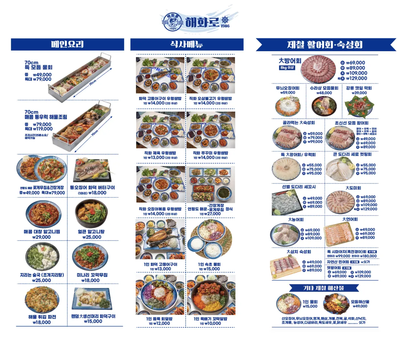 - 대표 메뉴: 70cm 대형 해물조림, 숙성 모둠회, 제철 해산물 요리들