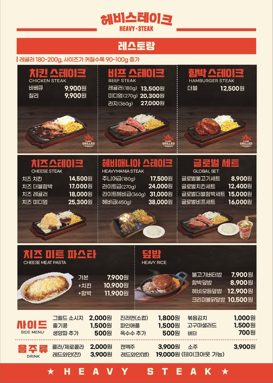 헤비스테이크는 직화 비프 스테이크를 중심으로 치킨 스테이크, 함박, 파스타, 덮밥류까지 구성된 메뉴판을 갖추고 있어요. 브랜드 기준 가격대는 치킨 스테이크류가 9,900원대, 비프 스테이크 레귤러가 13,500원, 미디엄·라지로 갈수록 2만 원대 초중반까지 올라가는 구조입니다.