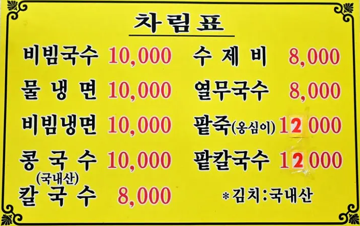 | 칼국수 | 9,000원 | 멸치육수 베이스에 넉넉한 양의 면과 야채가 들어가 담백하고 진한 국물 맛을 느낄 수 있는 메뉴예요. |