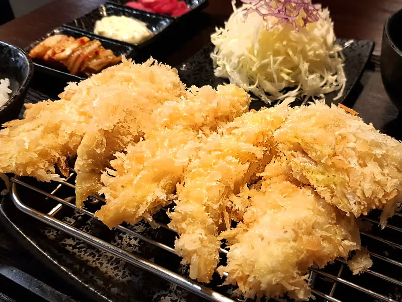 각 정식은 치킨까스와 밥, 샐러드, 국물, 소스들이 한 트레이에 담겨 나오는 구성이라 식사 만족도가 높다는 평이 많아요. 말돈 소금, 와사비, 타르타르 소스, 매콤 소스 등 여러 소스를 곁들여 각 부위의 식감을 비교하면서 먹는 재미도 있어요.