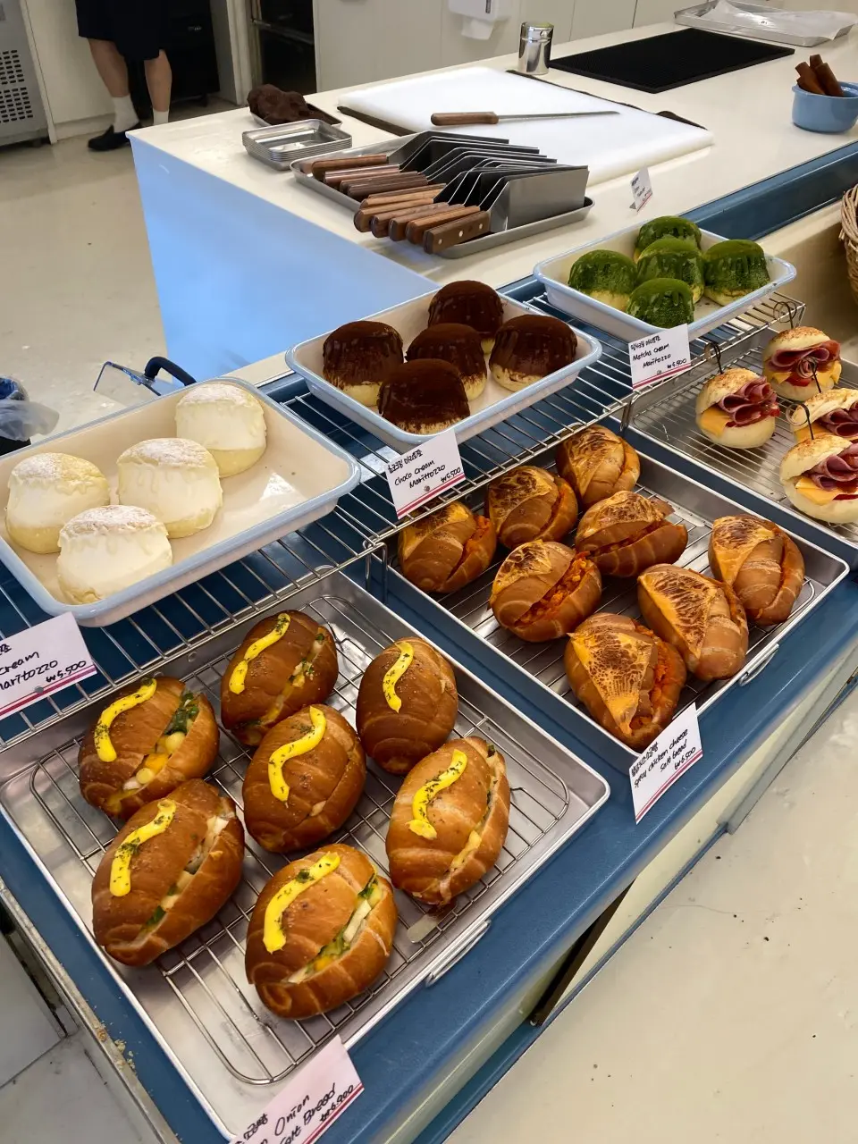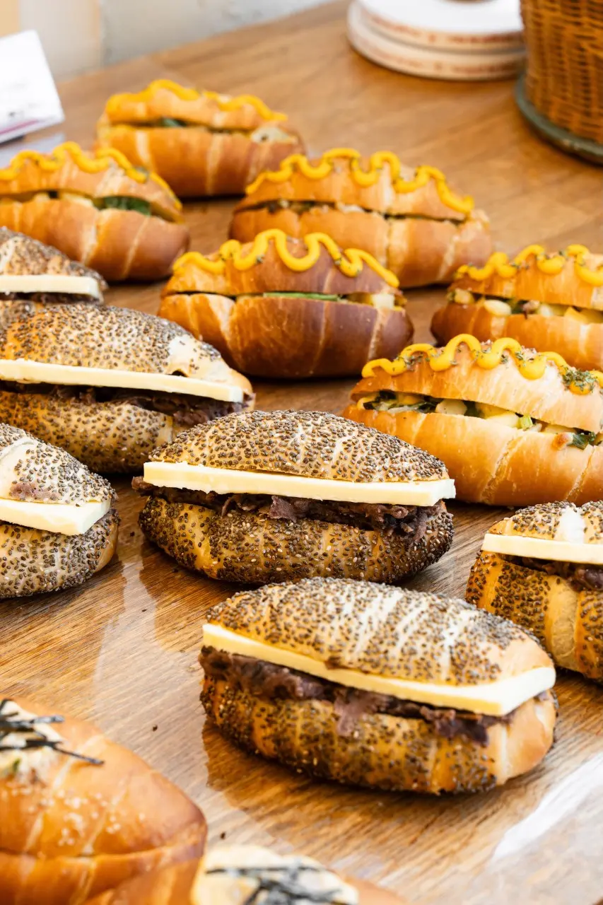 부케 드 뺑의 메인은 뭐니 뭐니 해도 다양한 소금빵 라인업과 티라미수 디저트·음료 조합이에요. 기본 소금빵부터 명란 소금빵, 바질 베이컨 소금빵 등 여러 베리에이션이 준비돼 있어 눈으로 먼저 즐기게 되는 비주얼이 특징이에요.