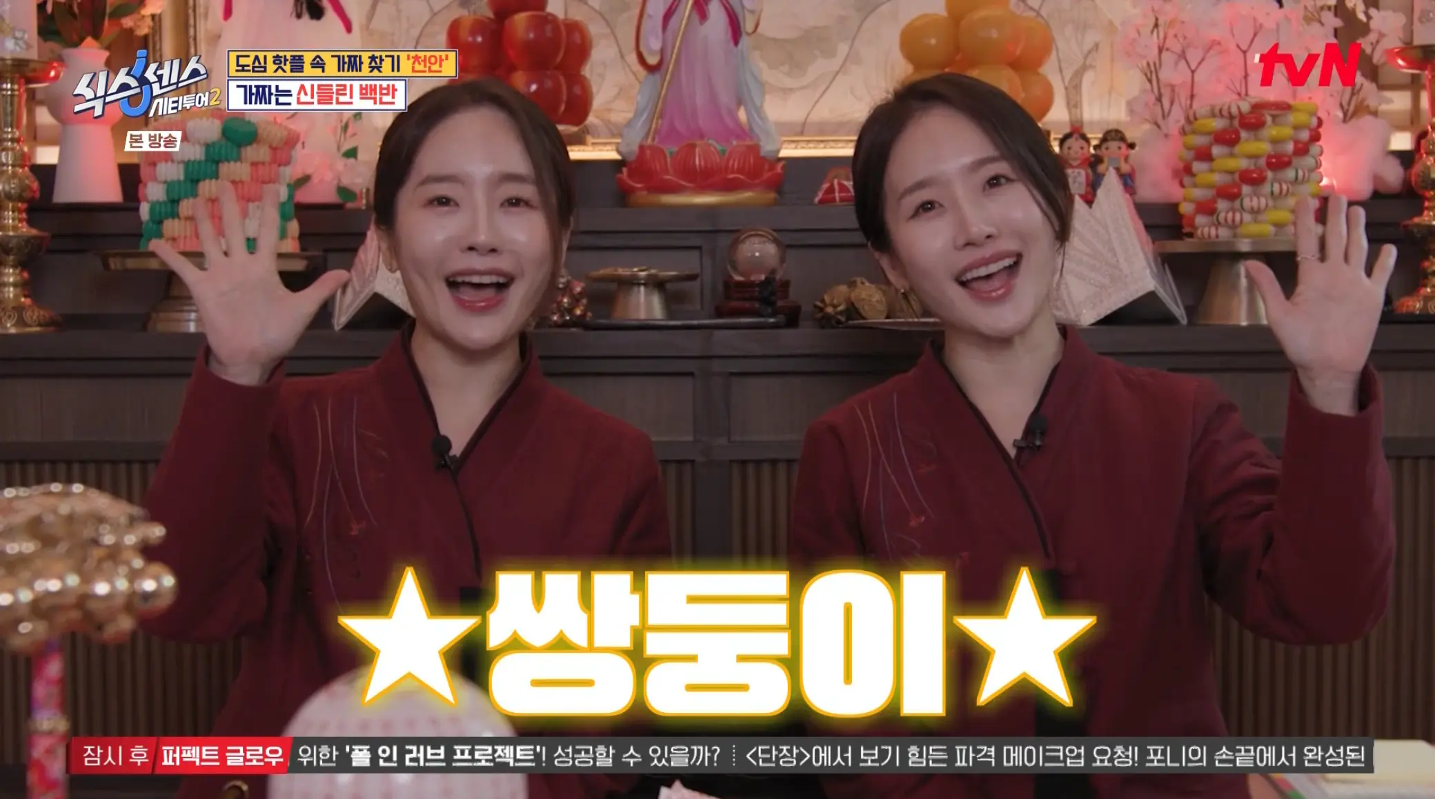 ‘식스센스 시티투어2’ 천안 편에서는 쌍둥이의 싱크로율 높은 비주얼과 찰떡 호흡으로 신점 보는 쌍화선녀 캐릭터를 소화하며 프로그램의 몰입감과 재미를 동시에 살렸어요. 짧은 분량이었지만, 쌍둥이라는 콘셉트를 극대화해 강한 인상을 남긴 출연이었죠.