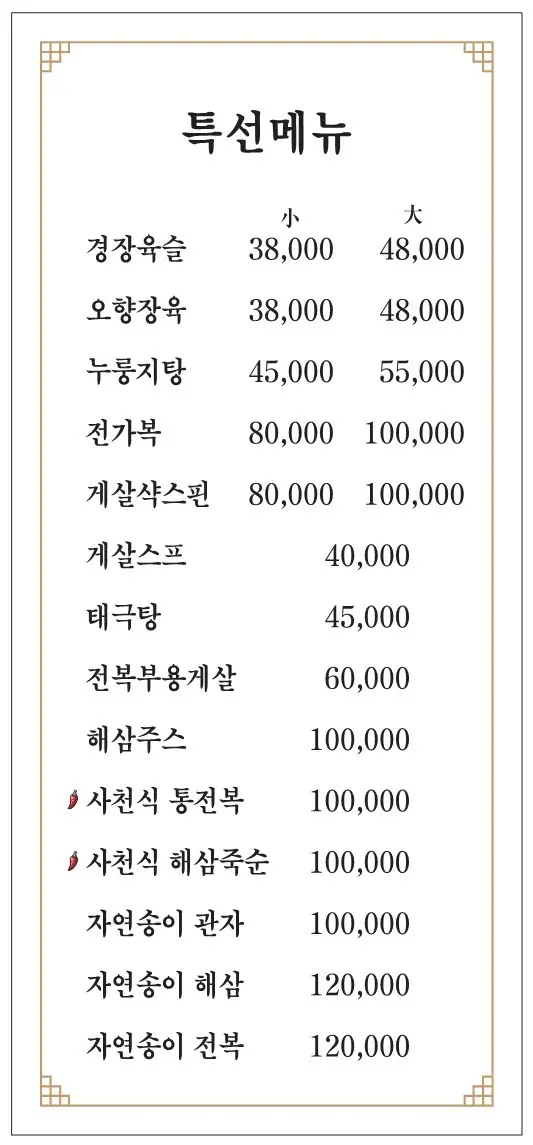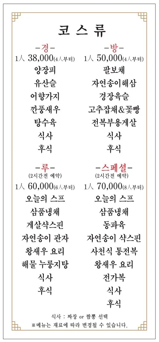 | 경 코스 (4인부터) | 38,000원/인 | 경방루 입문 코스, 가성비 좋은 구성 |