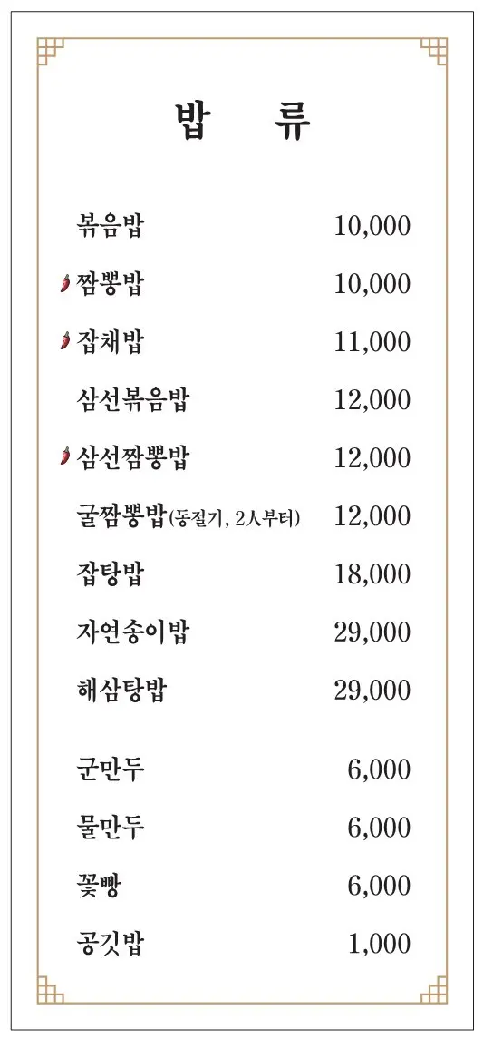 | 볶음밥/짬뽕밥 | 10,000원 | 밥 메뉴가 필요할 때 든든한 선택 |