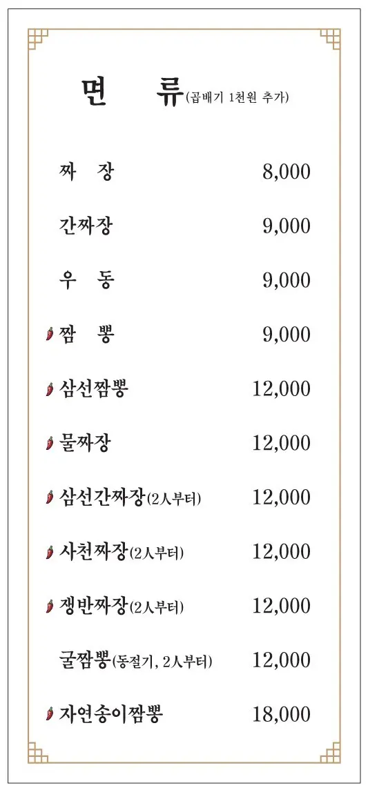 | 삼선간짜장/삼선짬뽕/물짜장/굴짬뽕/사천짜장 | 12,000원 | 한 단계 업그레이드된 프리미엄 단품 메뉴 |