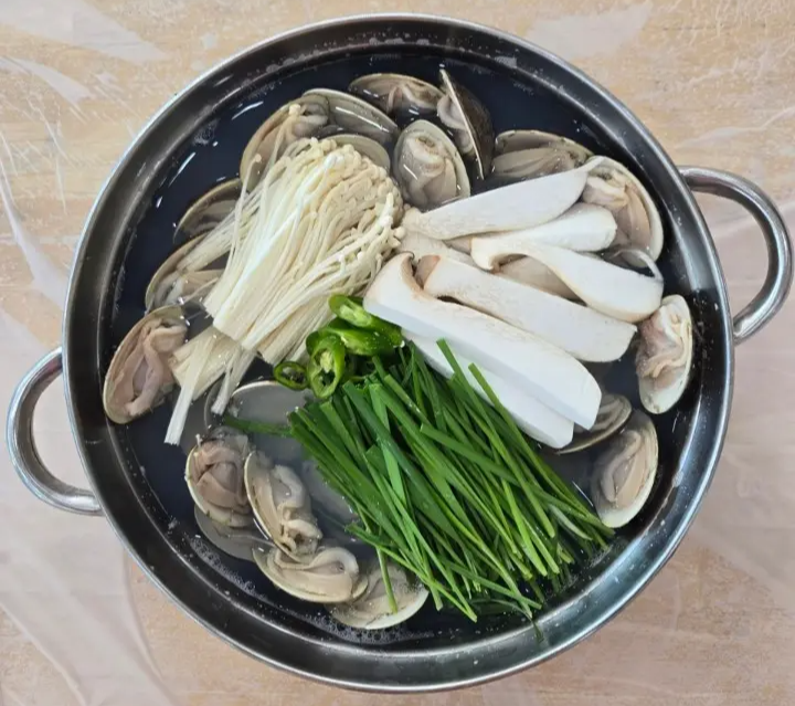 먼저 은박지에 싸여 나온 백합구이가 테이블에 올라오는데, 뜨끈한 국물과 탱탱한 조갯살을 한입에 먹는 재미가 있어요. 이후 시원한 백합탕과 칼국수 사리, 마지막으로 담백한 백합죽까지 나와서 해산물로 꽉 찬 한 끼를 즐길 수 있답니다.