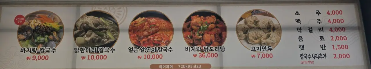 | 바지락 칼국수 | 9,000원 | 시원한 속풀이 칼국수, 2인 이상 주문 |