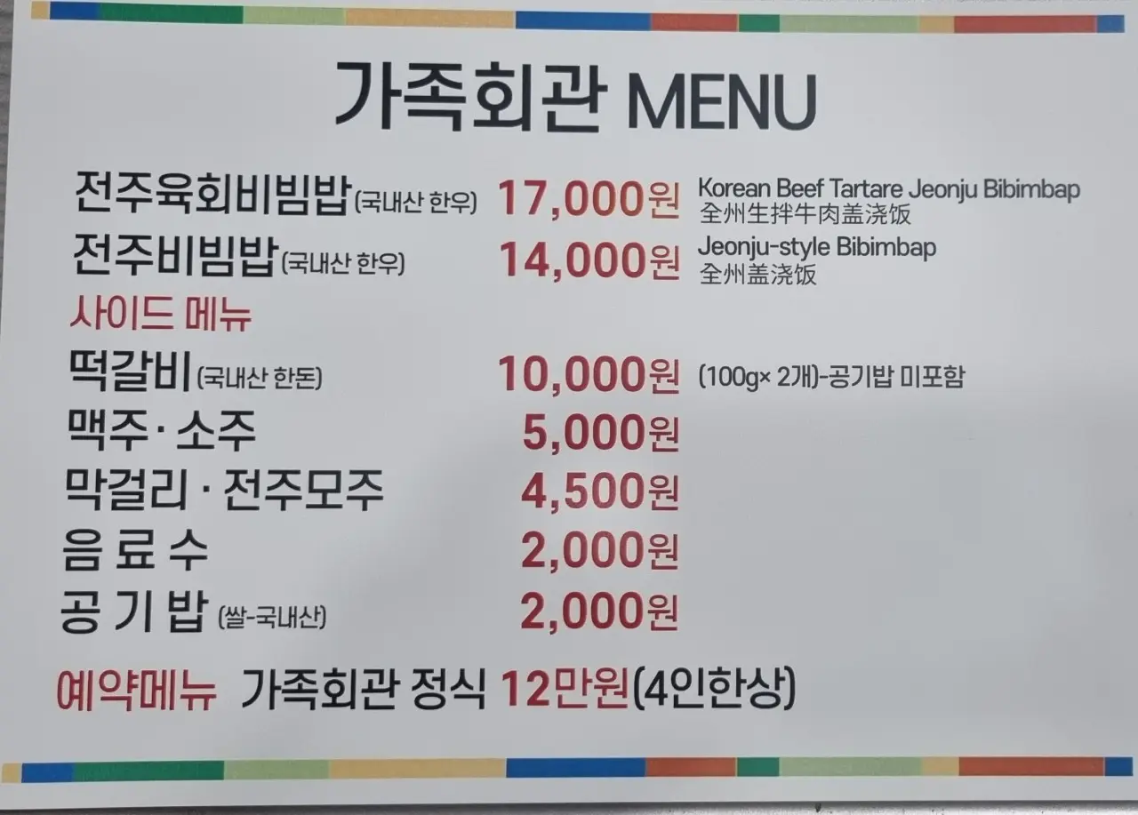 | 가족회관 정식 | 전주비빔밥·육회·떡갈비 등 코스로 즐기는 한 상 정식 | 120,000 (4인구성) |