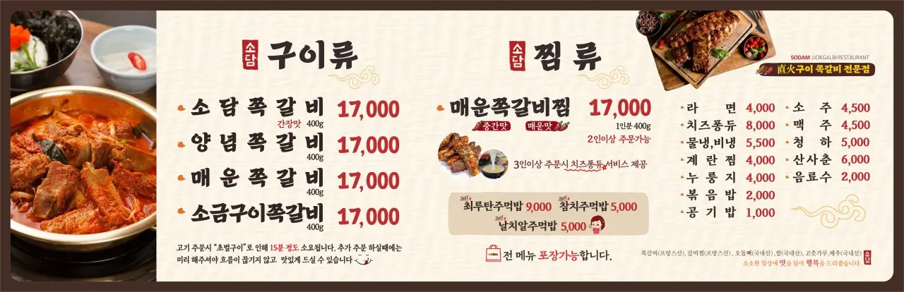 | 소담 쪽갈비 | 간장 베이스 정통 간장맛 쪽갈비, 불향 + 짭짤달달 맛. | 17,000 (1인 400g) |